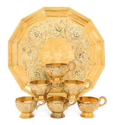 comprising six cups and a tray, the cups of hexagonal paneled form with a beaded S-scroll handle, the bodies chased with floral and volute motifs and raised on a hexagonal stem and foot, the tray similarly decorated, raised on ball feet.