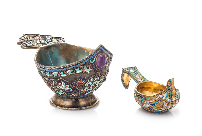the larger example having a hardstone inset body with allover floral and foliate decoration, the smaller example with a gilt finish and polychrome floral and foliate decoration.