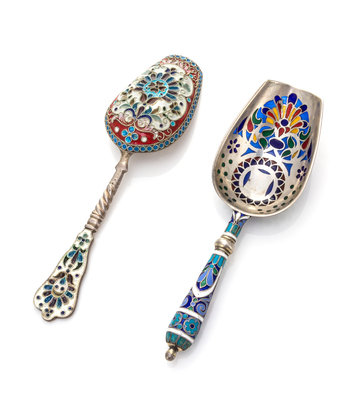 Two Russian Silver and Plique-a-Jour Sugar Scoops