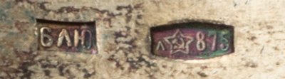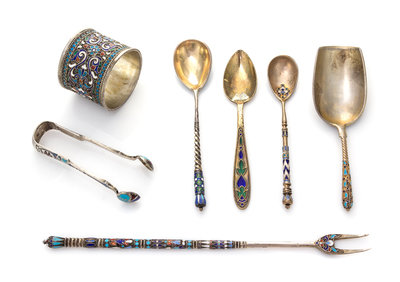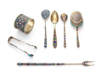 comprising a napkin ring marked Nikanov Zolotov, Moscow with polychrome floral and volute decoration, together with three spoons, a serving fork, a sugar scoop and a pair of sugar tongs, each decorated similarly with obscured makers' marks.