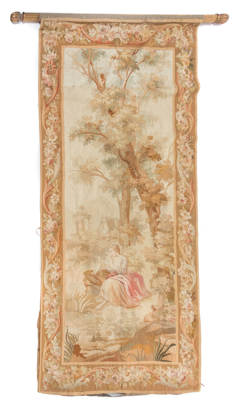 carved to show a seated lady in a forest landscape, the border worked to show floral sprays.