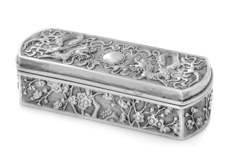 the lid worked with a repousse flaming pearl flanked by two writhing dragons, the sides decorated with prunus blossoms and branches.