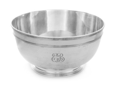 the banded body bearing the engraved monogram EB, raised on a stepped circular foot.