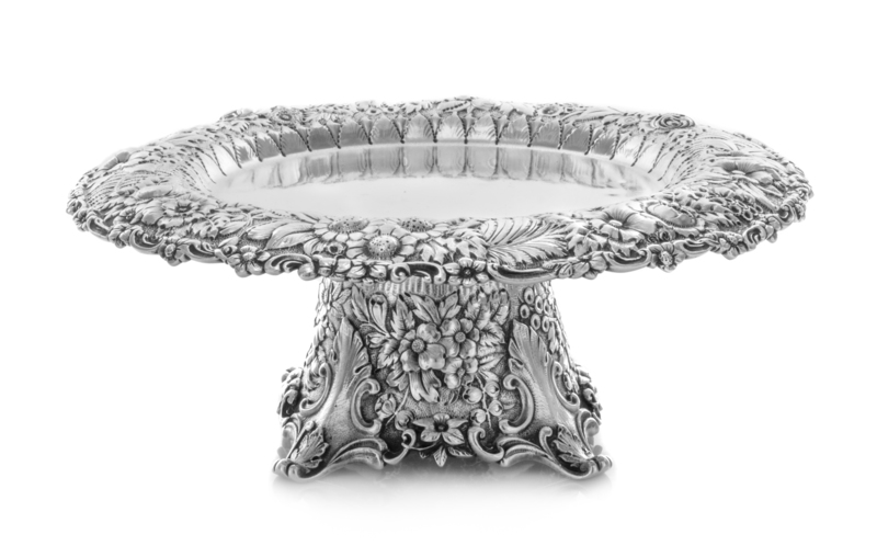 the rim worked to show floral and C-scroll motifs, the border having repousse floral and foliate decoration, raised on acanthus feet.