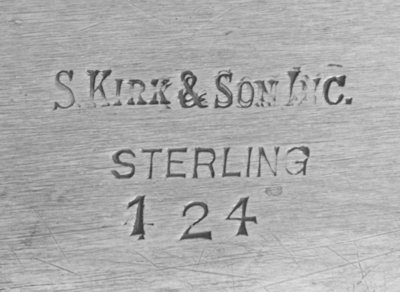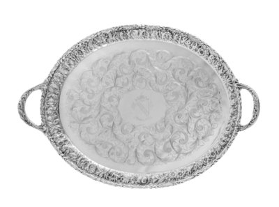 the twin-handled tray having a repousse floral and foliate border, the field centered with an engraved helmeted shield and the motto Auxilio Dei among foliate scrolls.