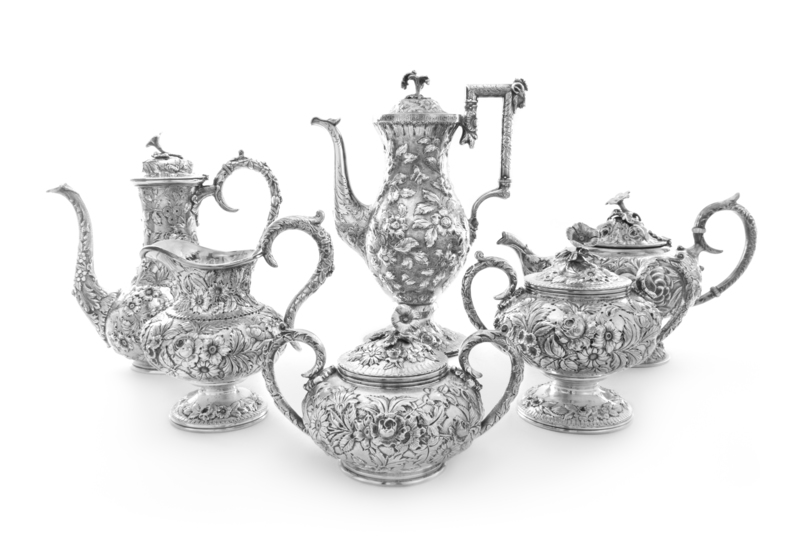 comprising a coffee pot, teapot, water kettle, creamer, covered sugar and covered waste bowl, each worked to show repousse floral and foliate elements.