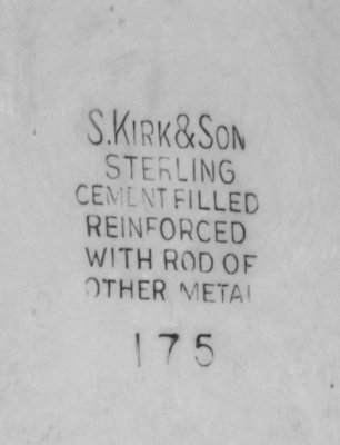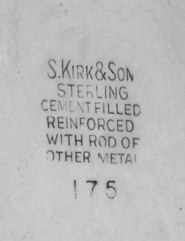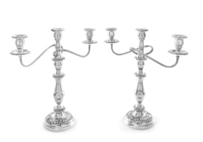 the central urn form candle cup having a repousse floral and foliate above the knopped stem issuing the two reeded branches with conforming candle cups, the trumpet form base with repousse floral decoration, weighted.