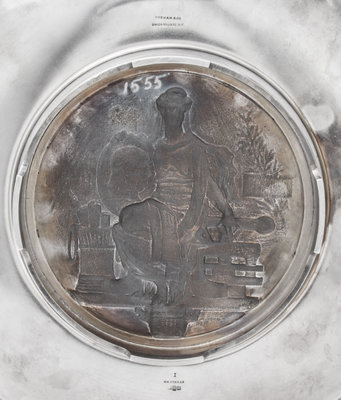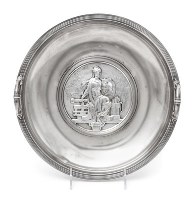 the twin-handled circular dish centered with a medallion commemorating Benjamin Franklin on the occasion of the United States Centennial.
