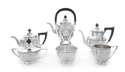 comprising a water kettle on stand, coffee pot, teapot, creamer, covered sugar and waste bowl, each having reeded banding, raised on a circular foot.