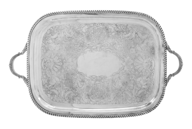 comprising a water kettle on stand, teapot, coffee pot, creamer, covered sugar and waste bowl, each having a beaded rim and a paneled body of tapering octagonal form raised on a conforming foot with an engraved monogram, together with an associated silver-plate serving tray with a gadroon border.