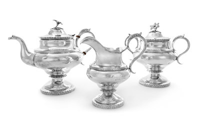 comprising a coffee pot, covered sugar and creamer, each having a baluster form body with acantus banded foot rims, the lidded elements with a floral finial.