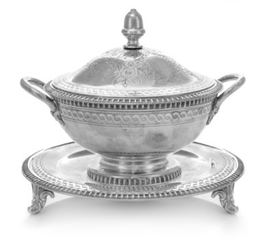 the tureen lid decorated with stippled floral and foliate motifs, the twin-handled body with a coin-meander band, the underplate with similar decoration and raised on three foliate feet.
