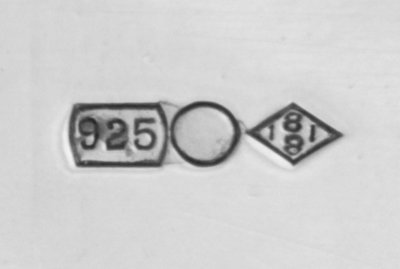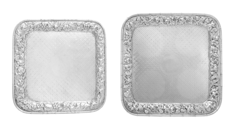 each of square form, the borders worked with repousse floral and foliate motifs on a stippled ground, the field chased with diapering centered by an erased cartouche and raised on four claw-and-ball feet.