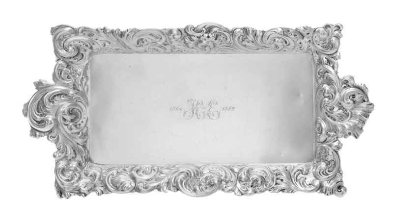 or rectangular form, the border and handles worked to show repousse foliate and volute decoration, the field centered by an engraved monogram.