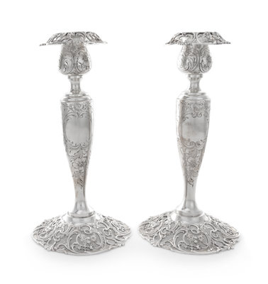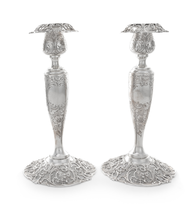 the rim and foot both decorated with openwork floral and foliate decoration, the baluster stem chased with similar decoration surrounding vacant cartouches, weighted.