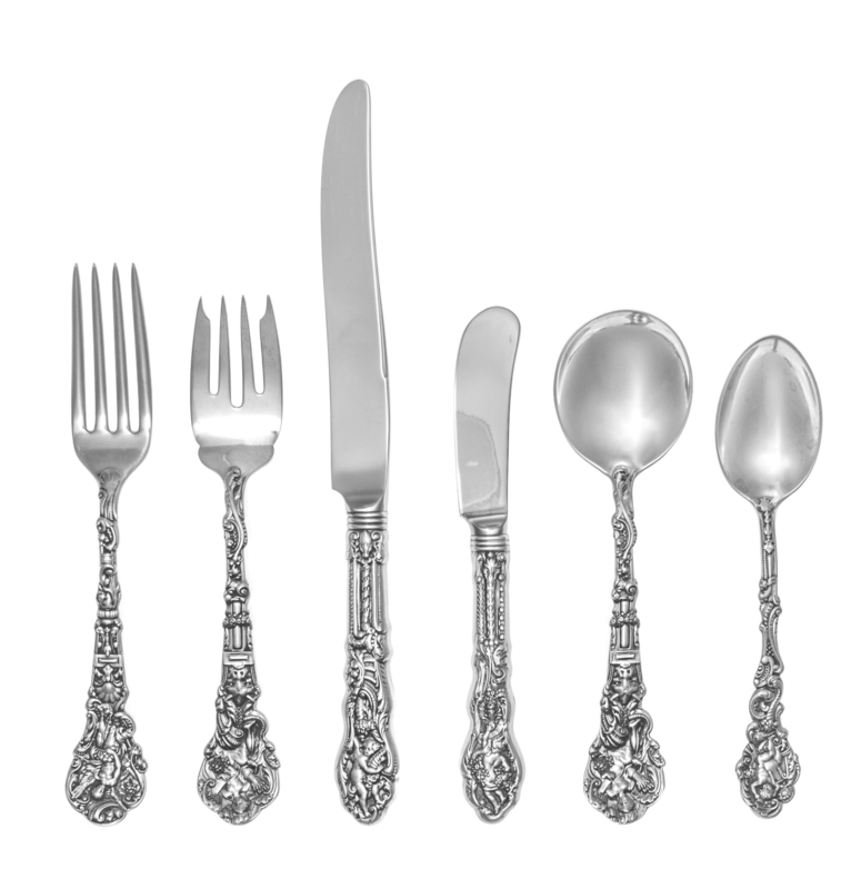 Versailles pattern, comprising: 12 dinner knives12 dinner forks10 salad forks6 cocktail forks12 soup spoons12 cream soup spoons24 teaspoons12 citrus spoons12 butter spreaders1 table spoon1 berry spoon1 rice spoon1 sugar spoon1 bonbon spoon1 tea strainer1 cream ladle1 master butter knife1 pickle fork1 fish fork1 2-piece carving set