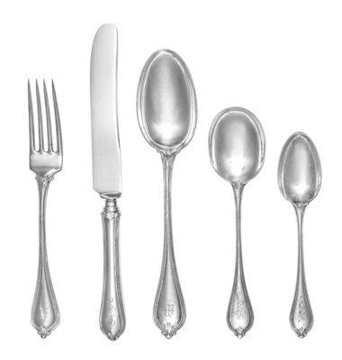 Old Newbury Pattern, comprising:12 dinner knives18 luncheon knives12 dinner knives18 luncheon forks18 teaspoons12 soup spoons12 egg spoons12 coffee spoons4 table spoons1 master butter knife1 sauce ladle1 cake slice