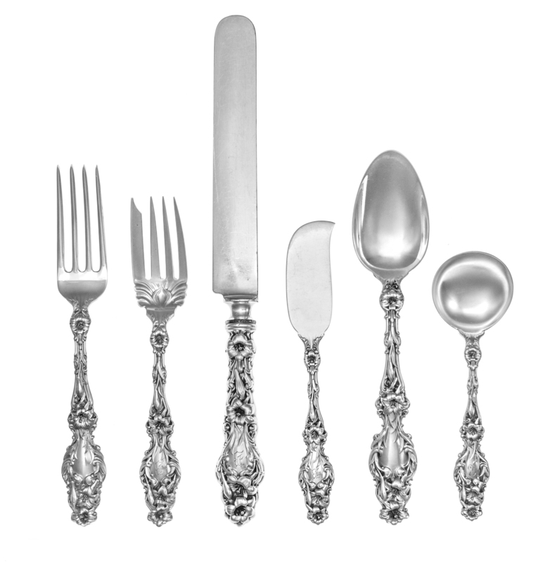 Lily pattern, comprising:12 dinner knives12 dinner forks20 luncheon forks12 salad forks12 cocktail forks6 table spoons20 teaspoons23 afternoon teaspoons6 soup spoons11 cream soup spoons12 bouillon spoons12 coffee spoons12 flat-handled butter spreaders6 lemon forks2 serving forks1 master butter knife2 serving spoons1 olive fork1 lettuce fork1 sauce ladle1 cream ladle1 sugar scoop1 tea scoop1 sugar tongs