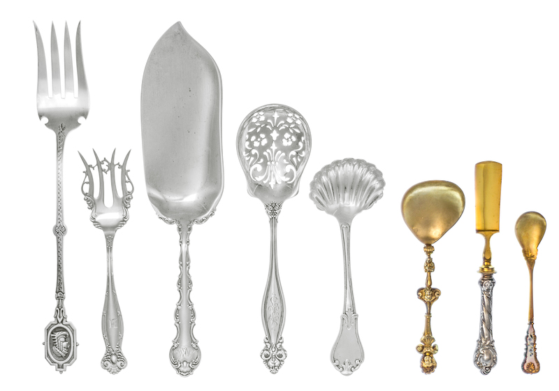 comprising serving spoons, table spoons, teaspoons, sugar scoops, apostle spoons, serving forks, dessert forks, two-piece carving sets, ladles and others.