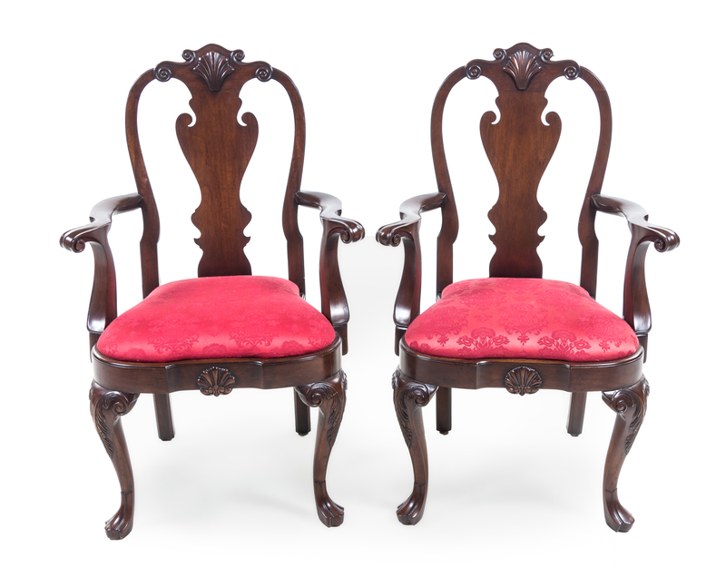 each having a shaped crest rail carved to show a fan flanked by S-scrolls above the shaped vertical splat and drop-in cushion seat within open arms, raised on cabriole fore-legs carved to show foliate scrolls at the knees and ending in trifid feet.