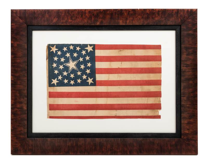 printed on cotton with a larged haloed center star pattern, in an ebonized oak and mahogany frame.