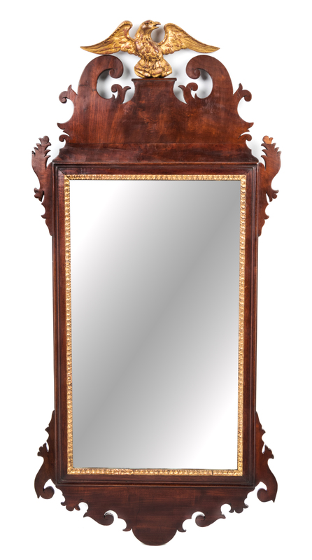 the broken arch pediment centered with an eagle finial with outstretched wings above the vertical rectangular mirror plate within a shaped frame.