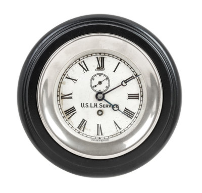 the circular dial with Roman numeral hours, further set with a seconds dial, signed U.S.L.H. Service, accompanied by a framed certificate indicating that the clock was first sold in 1930 to the Superintendent of Lighthouses.