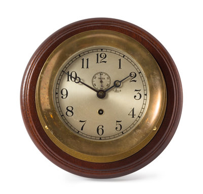 the silvered dial with Arabic numeral hours, further set with a seconds dial, signed Chelsea, set into a mahogany back.