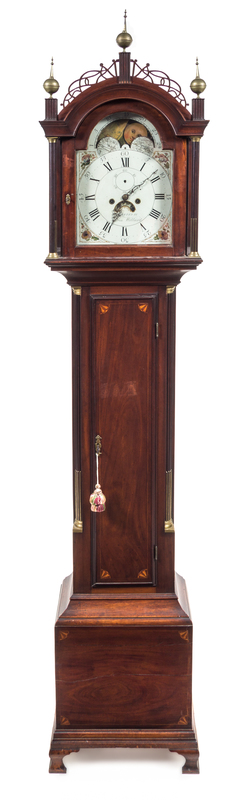 the domed hood having three spherical brass finials and a fretwork cornice above the painted moonphase dial with Roman numeral hours and Arabic numeral minutes signed Warranted by/ Aaron Willard, flanked by Doric fluted columnar supports, the straight trunk fitted with a door inlaid to show shells at the corners and flanked by fluted columnar supports, raised on ogee bracket feet, the dial stamped WILSON BIRMm. to the reverse, with an eight-day time and strike movement.
