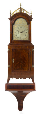 the three baluster form finials set on reeded supports joined by foliate fretwork above the domed molded cornice and glazed door opening to a painted dial with Roman numeral hours and Arabic numeral minutes, signed David Wood/ Newburyport, the lower case fitted with a door flanked by reeded columnar pilasters, raised on splayed legs, further set on a later bracket.