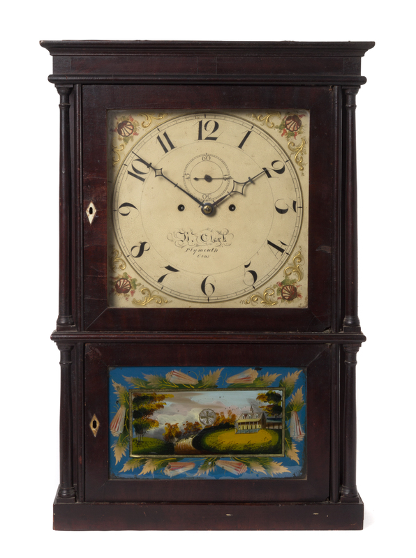 having a molded projecting cornice above the glazed door opening to a painted dial with Arabic numeral hours signed A. Clark/ Plymouth/ Con., the dial flanked by painted shell and gilt foliate scroll spandrels and further set with a seconds dial, the lower case inset with a reverse painted glass panel depicting a home in a pastoral landscape within a stenciled shell and foliate border, all flanked by columnar pilasters, raised on a plinth base.