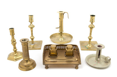 comprising a 19th century push-up example; a 19th century pair with knopped stems and two others, together with a late 20th century painted metal example and a Mottahedeh brass ink stand.