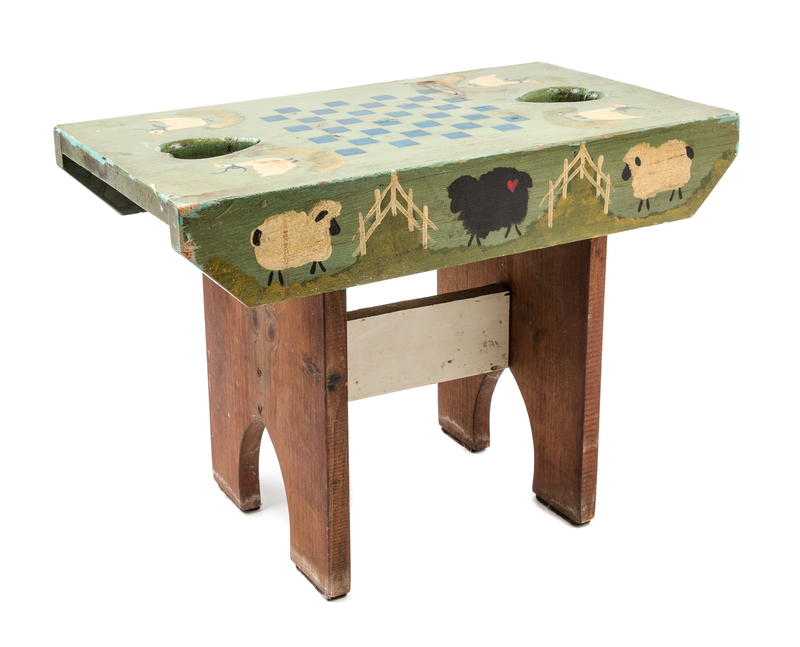 the rectangular top with cutout hearts and painted to show a game board flanked by geese, raised on twin supports joined by a stretcher.