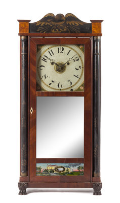 the shaped crest with stenciled decoration depicting an eagle clutching arrows in its talons above the glazed and mirrored door opening to a painted dial with Arabic numeral hours flanked by shell spandrels, the lower reverse painted panel depicting a town in a pastoral landscape marked Time is Money, all flanked by columnar pilasters, raised on carved paw feet.