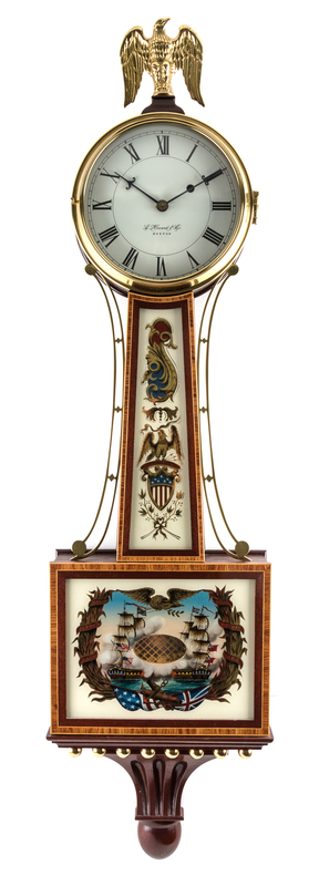 having an eagle finial above the circular dial with Roman numeral hours signed E. Howard & Co./ Boston, the lower tablet reverse-painted to depict a naval battle marked Sept. 10 Perry's Lake 1813 Victory Erie, all above the fluted bracket with beaded decoration.