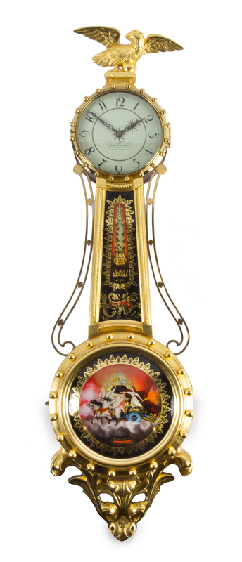 having an eagle finial above the circular dial with Arabic numeral hours signed Foster S. Campos/ Pembroke Mass., the throat tablet marked Patent, the lower tablet of convex circular form, decorated to show Aurora driving a winged-horse chariot, all over the pierce carved foliate bracket.