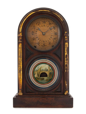 the domed case having a twenty-four hour dial with Roman numeral hours, Arabic numeral minutes and Chinese numerals, over an inset circular reverse-painted panel depicting a harbor scene, raised on a rectangular plinth.
