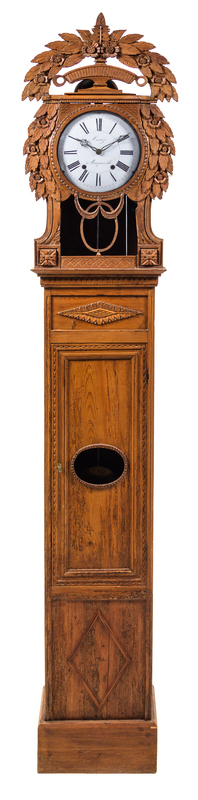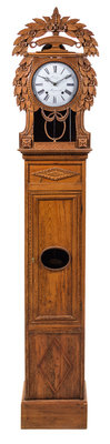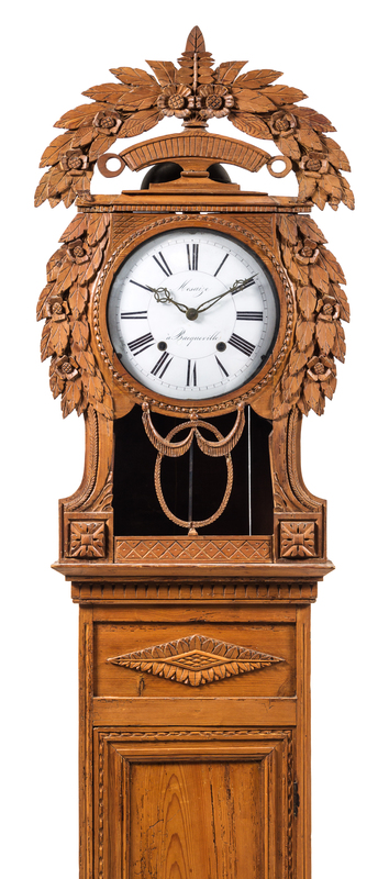 the openwork crest carved to show a flowering urn above the circular enameled dial with Roman numeral hours signed Mesaize a Bacqueville flanked by floral garlands, the straight paneled trunk raised on a plinth base.