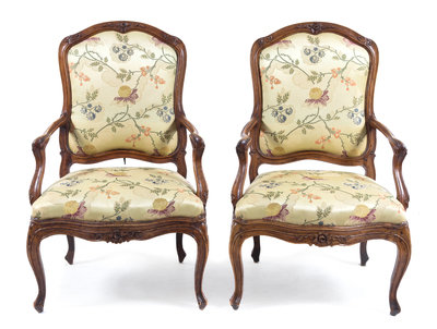 each having a floral carved crest rail above the padded back and stuffover seat within open arms, raised on cabriole legs.