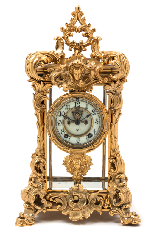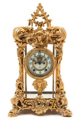 Regal model, the case cast to show a male mask among rocaille, C-scrolls and foliate decoration, the glazed sides and door opening to a circular dial with Arabic numeral hours, raised on shaped feet.