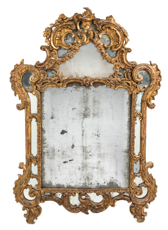 the openwork shaped crest carved to show C-scrolls, rocaille and floral decoration above the vertical segmented mirror plate within a conforming frame similarly carved to show foliate scrolls and rocaille.