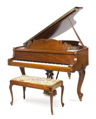 serial number 422532, the case raised on foliate carved cabriole legs ending in scroll feet and casters, with an associated bench.
