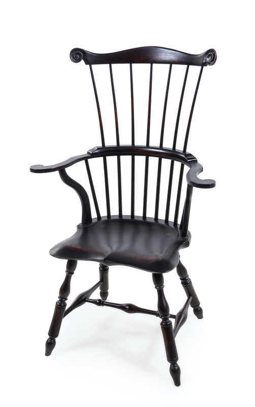 the curved crest rail above the spindled back and molded seat within open arms, raised on turned cylindrical legs joined by an H-form stretcher.