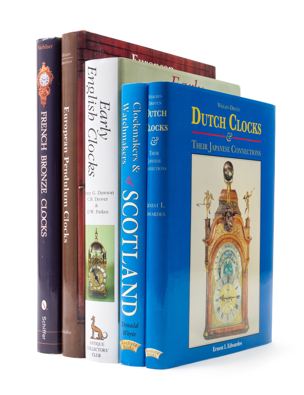 comprising: Niehuser, Elke. French Bronze Clocks, 1700-1830: A Study of the Figural Images. Schiffer Publishing Ltd., Atglen, PA, 1999.Heuer, Peter and Dr. Klaus Maurice. European Pendulum Clocks. Schiffer Publishing Ltd., West Chester, PA, 1988. Dawson, Percy G., et al. Early English Clocks. Antique Collectors' Club, Suffolk, England, 1982. Whyte, Donald. Clockmakers & Watchmakers of Scotland. Mayfield Books, Derbyshire, England, 2005.Edwardes, Ernest L. Weight-Driven Dutch Clocks & Their Japanese Connections. Mayfield Books, Derbyshire, England, 1996.