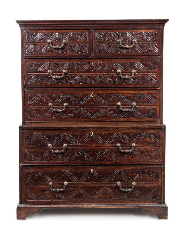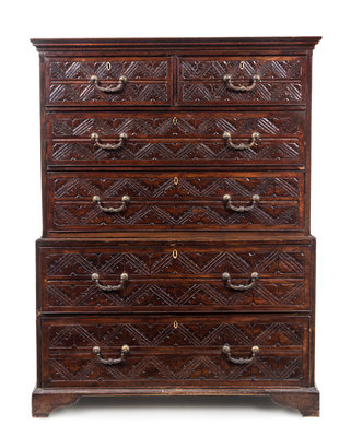 in two parts, the superstructure having a molded projecting cornice above two aligned short drawers and two long drawers, the base fitted with two long drawers, raised on bracket feet, the drawers carved to show repeating foliate and geometric decoration.