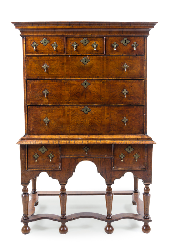 in two parts, the superstructure having a projecting molded cornice above three aligned short drawers and three graduated drawers, the base fitted with three drawers over a shaped skirt, raised on turned cylindrical tapering legs joined by a curvilinear stretcher and ending in flattened ball feet.