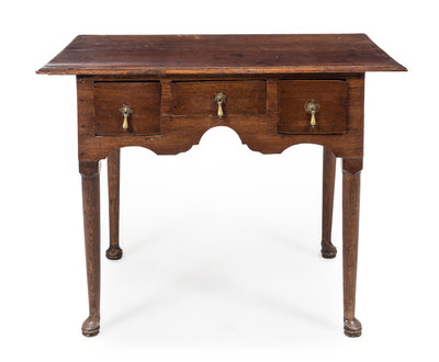 having a rectangular top above a case fitted with three drawers, raised on cylindrical tapering legs ending in pad feet.