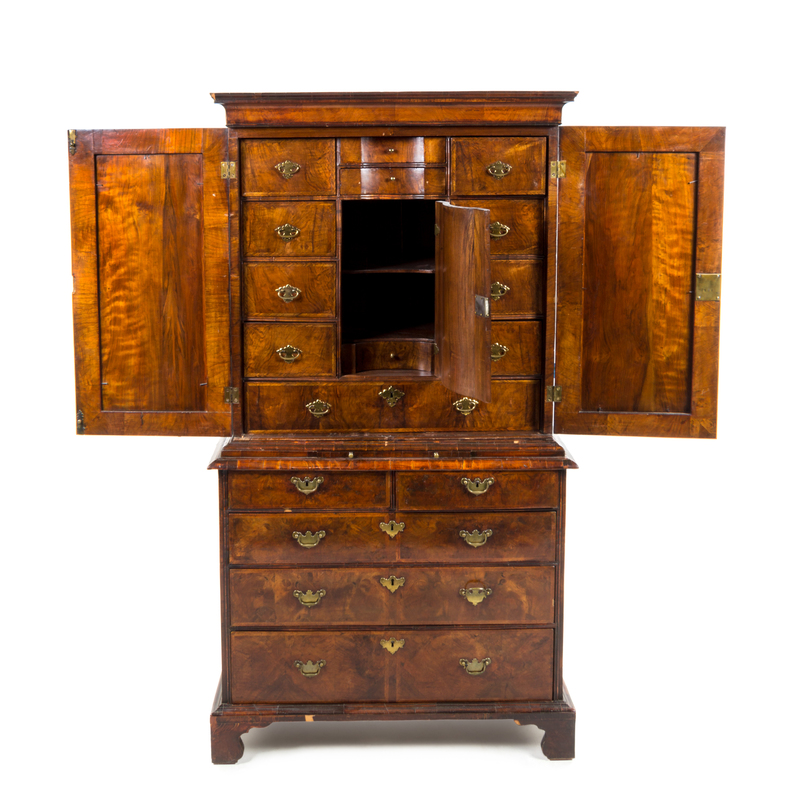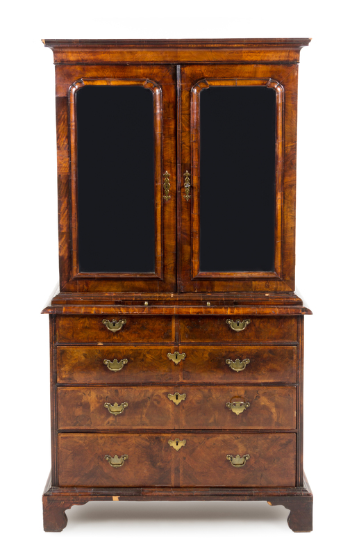 in two parts, the superstructure having a molded projecting cornice above two doors inset with beveled mirror plates opening to a series of drawers centered with a door above a candle slide, the base fitted with two short drawers over three graduated long drawers, raised on bracket feet.
