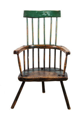 having a straight crest rail above the spindled back, curved arms and shaped plank seat, raised on splayed cylindrical legs.