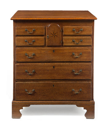 having a rectangular top above a central door inlaid with a six-pointed star and flanked by four short drawers above three graduated long drawers, raised on bracket feet.